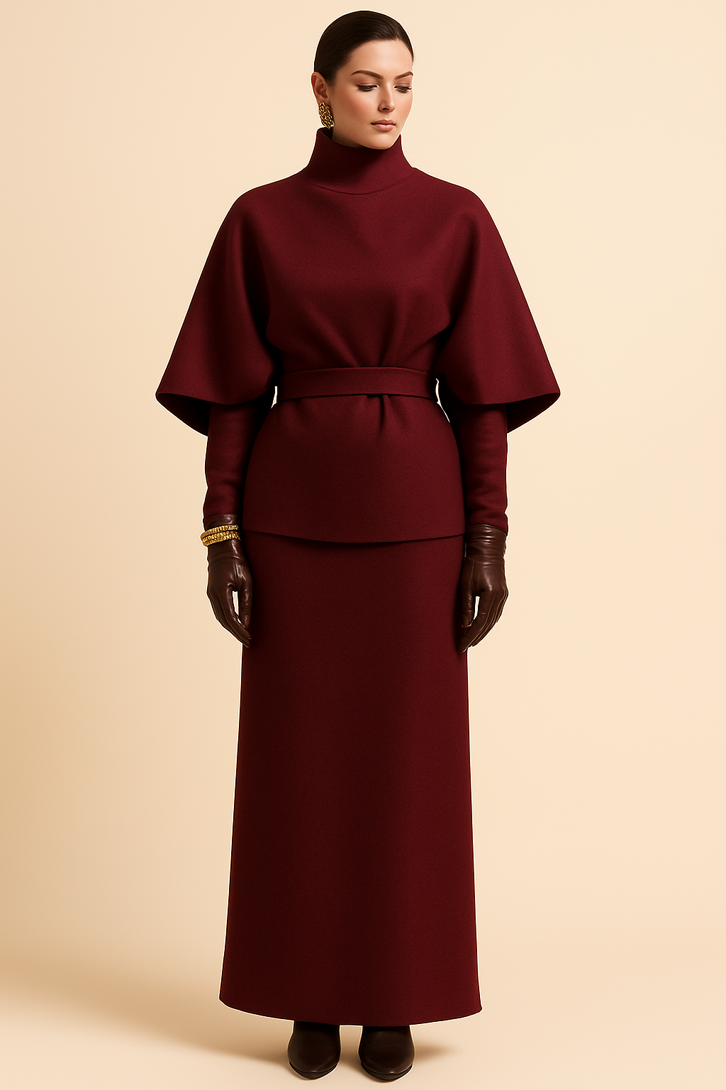 Rendered in a deep, reverent crimson, this two-piece wool skirt set reclaims bold color through discipline rather than display. The high neckline establishes authority. The sculptural cape sleeve creates presence without exposure. The column skirt grounds the silhouette in quiet power.